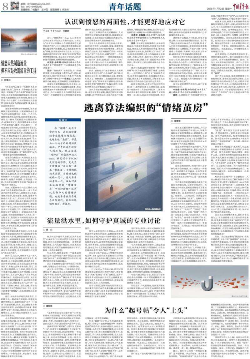 愤怒诱饵会让人上钩,是因为创作者花心思编造剧本、利用平台算法收割流量,广告商借此谋取利润,最后“受伤”的往往是被蒙骗的愤怒网友。因此,我们在转发、评论、点赞之前,要提醒自己夺回情绪自主权,作出理性决策,这样才能在越来越汹涌的信息洪流中,守住自身尊严与社会温度。