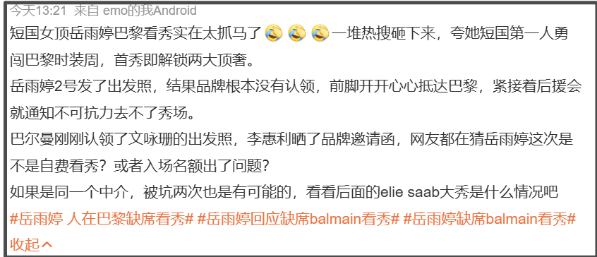 还有一点不得不提,岳雨婷人在巴黎没能进场,然而她还是没有意识到问题,竟然发文回应因为不可抗力才缺席看秀,某种程度上,这个行为比蹭秀更恶劣。