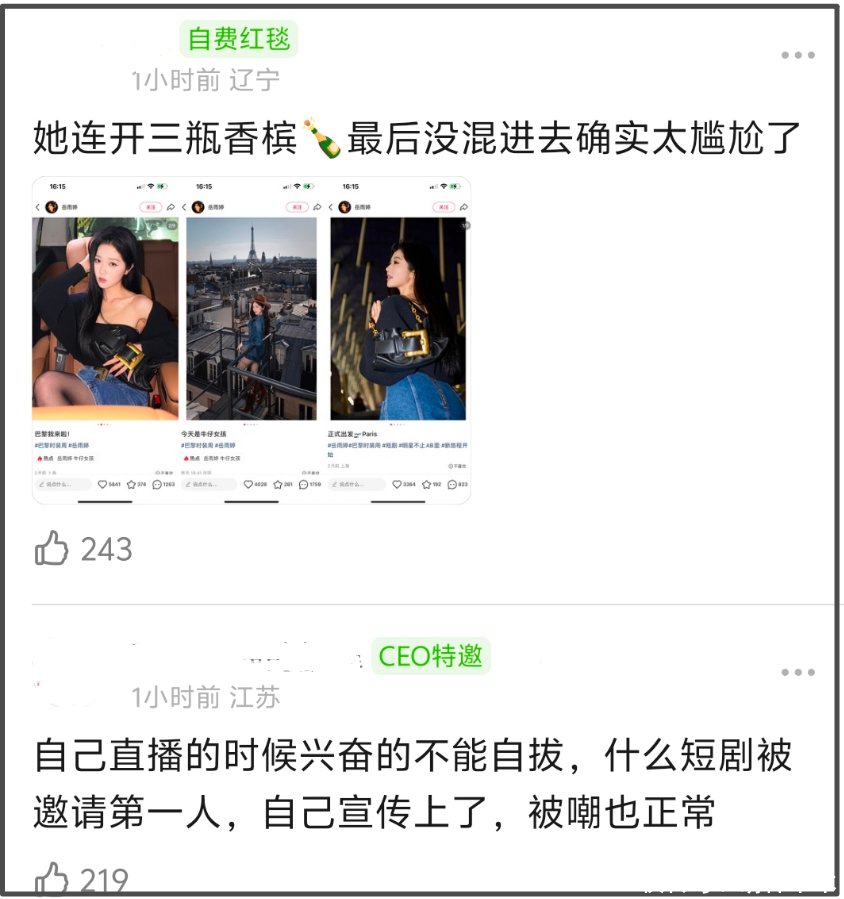 首先,岳雨婷本人去巴黎之前开了一场直播,放出豪言要闪耀巴黎,反复强调妆发、造型都是品牌方提供。