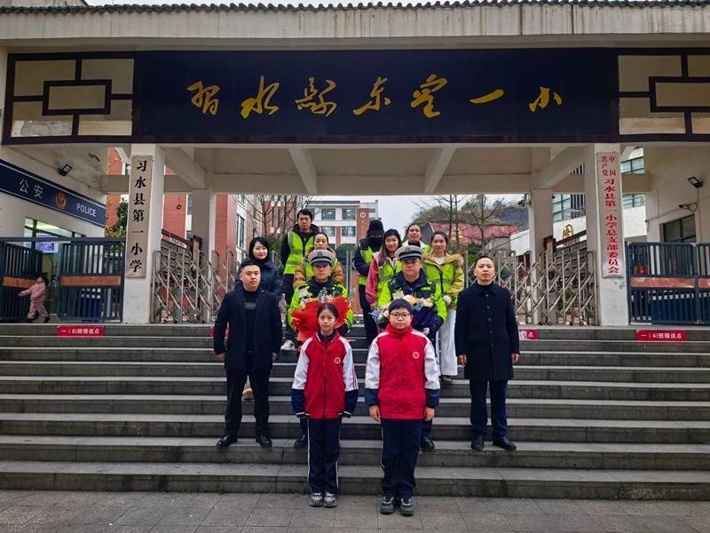 习水一小门前,少先队员向交警献花致敬,暖冬送温情。