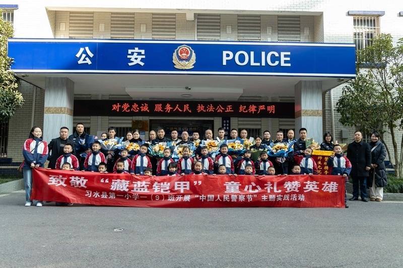 习水一小一(9)班师生与民警合影,共庆中国人民警察节。