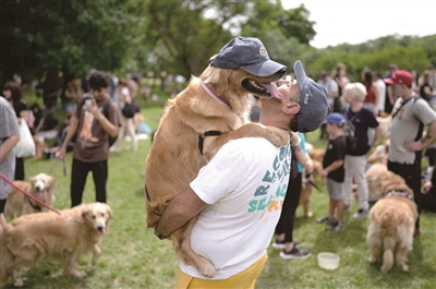 这场名为“黄金浪潮”的活动源于社交网络,很快发展成一场超大型狗狗聚会。年龄不一的金毛犬齐聚一堂,有在地上打滚玩耍的活泼幼犬,也有戴着圣诞帽、系着缎带的成年狗狗悠闲地散步,主人们一边喝茶,一边拍照留念。