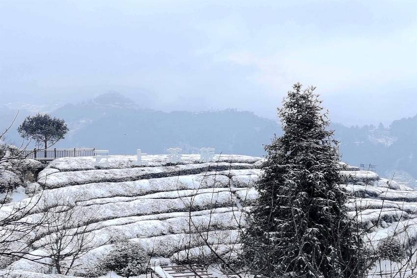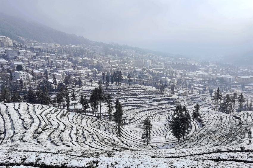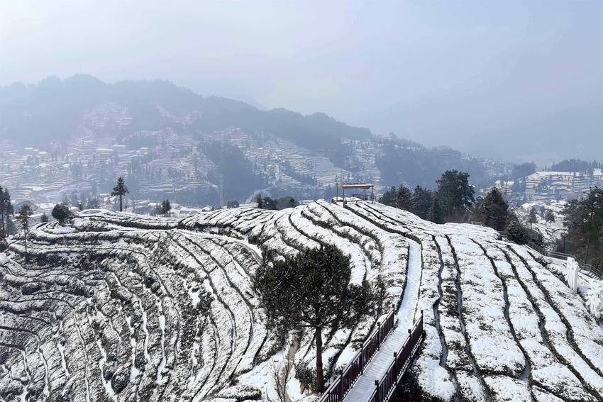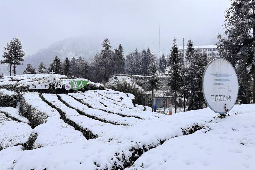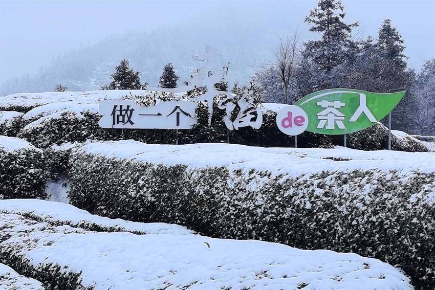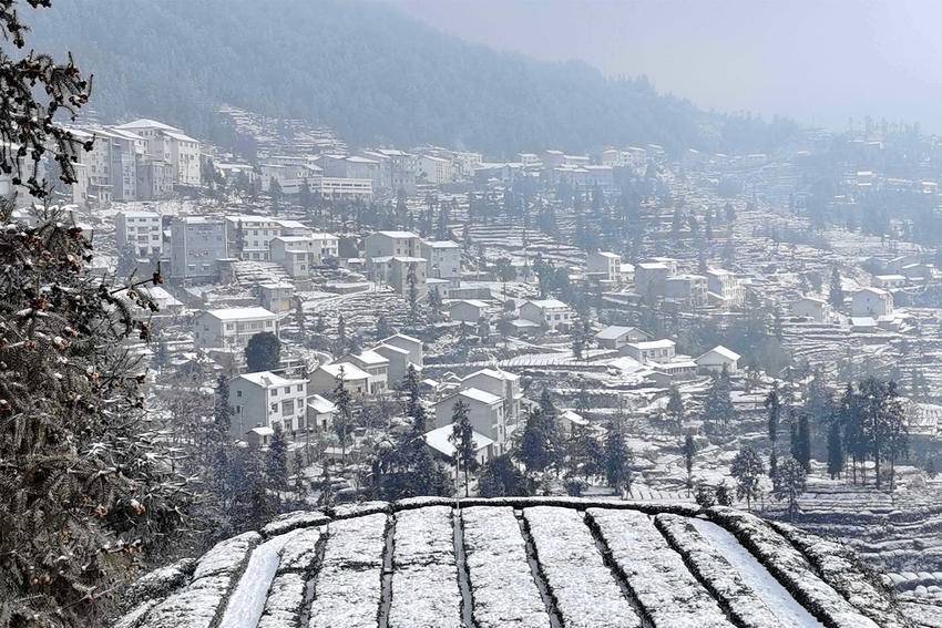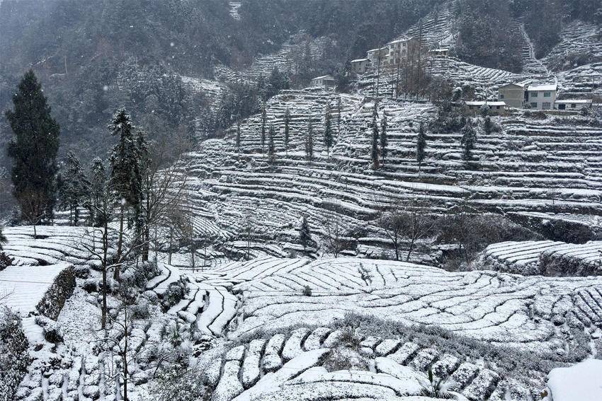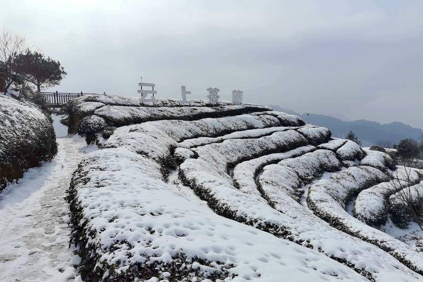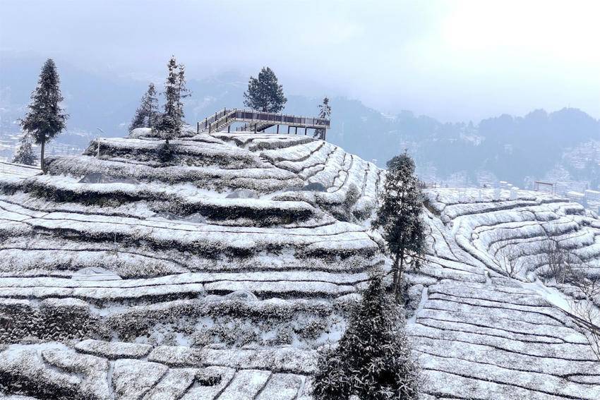 ↑ 2026年1月22日,在宜昌市夷陵区邓村乡,三峡茶旅小镇一带落雪后的生态茶园呈现一片银装素裹景象。